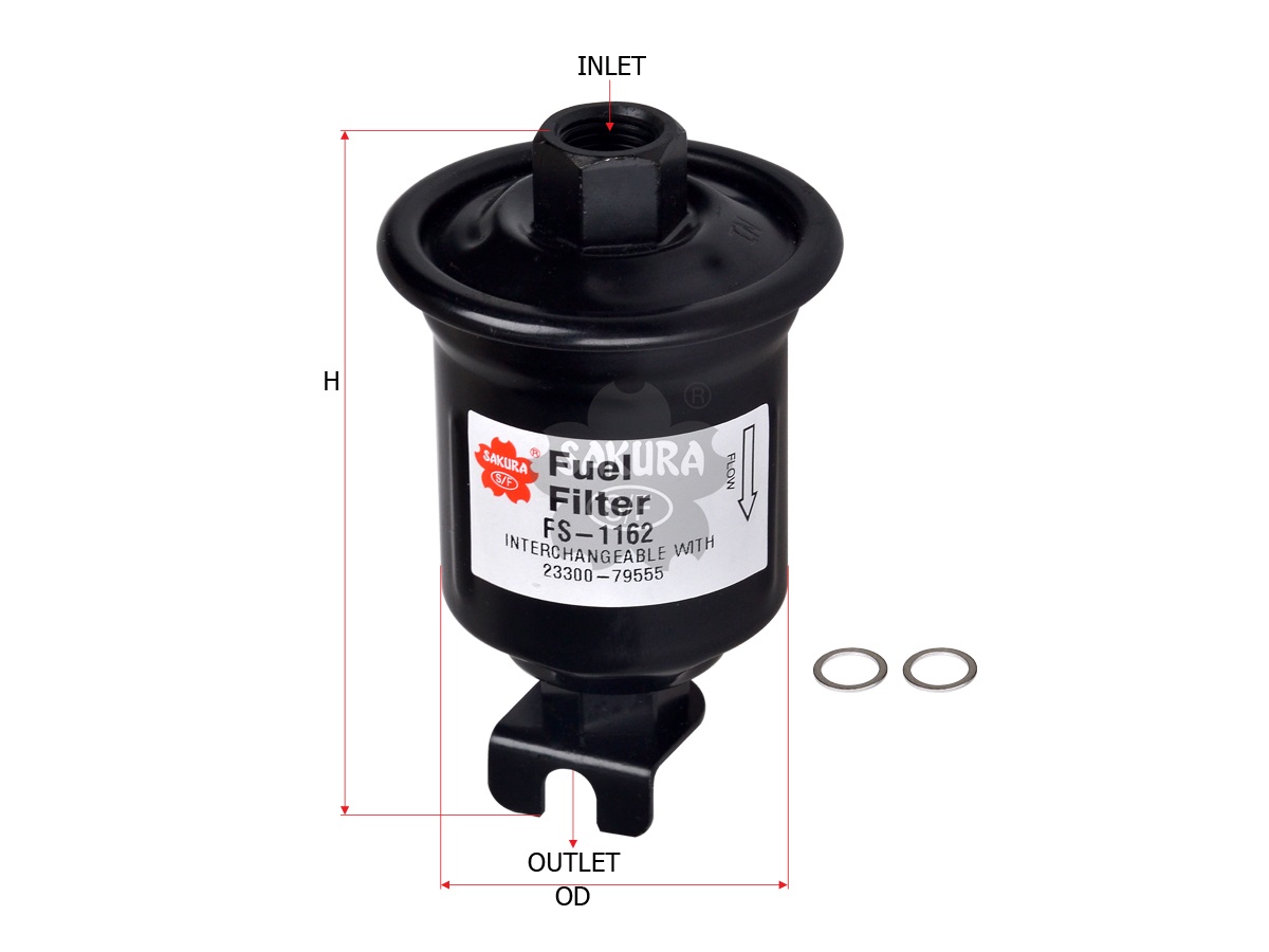 Product Name: FS-1162 Sakura Fuel Filter; Part No: FSAFS1162; OEM Equivalent: 23300-11150; Cross References: Ryco Z573, Wesfil WZ573; Height: 110 mm; Thread: M14X1.5-6H; Inner Width: 70 mm; Inner Length: 70 mm; Filter Type: In-Line Filter.