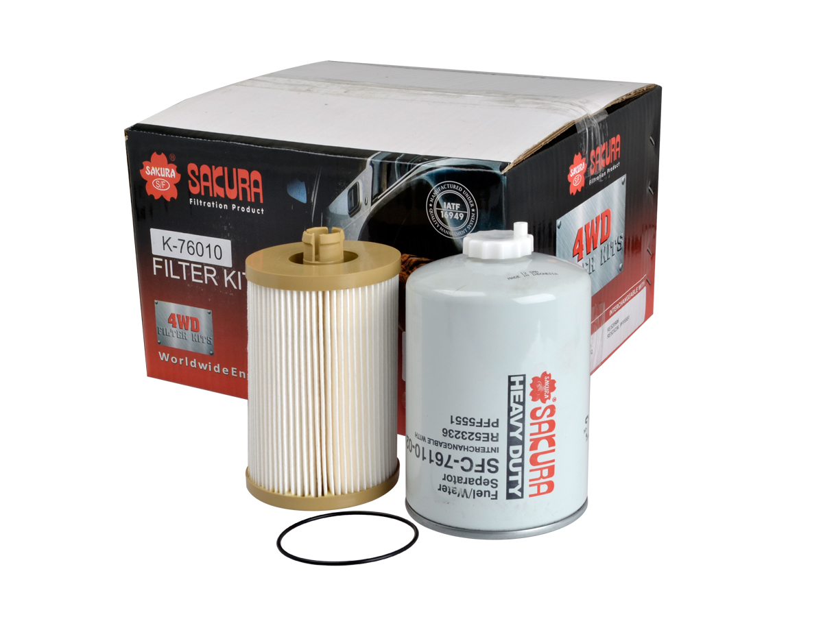 The Sakura K-76010 Fuel Filter Set is designed for optimal filtration in John Deere equipment, ensuring longevity and efficiency. It includes a primary filter (ES-76010-10) and a secondary filter (SFC-76110-02) to provide comprehensive protection against contaminants that can harm the engine. This set suits various John Deere models as referenced with manufacturer numbers such as PFF5551 KIT RACOR/PARKER, RE525523, RE520906, and RE523236.